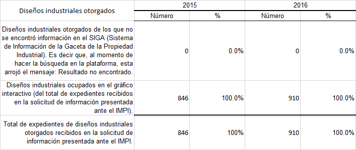 • Para el año 2016: Elaboración propia con datos obtenidos de la solicitud de Información al Instituto Mexicano de la Propiedad Industrial (Folio 1026500008017 / 8 de Febrero de 2017).