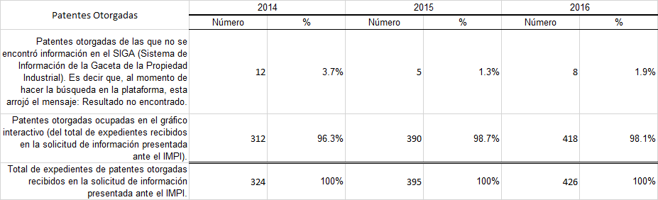Con la información obtenida se hizo un primer filtro para verificar que la información estuviera bien clasificada, a fin de evitar errores como por ejemplo, que en el apartado de patentes el Instituto haya puesto por error información de alguna otra figura de invenciones o de propiedad industrial.