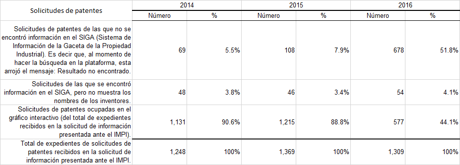 Se presentaron diversas solicitudes de información ante el Instituto Mexicano de la Propiedad Industrial, en las que se solicitaron datos como los números de expedientes de todas las solicitudes de patente presentadas en diversos años.